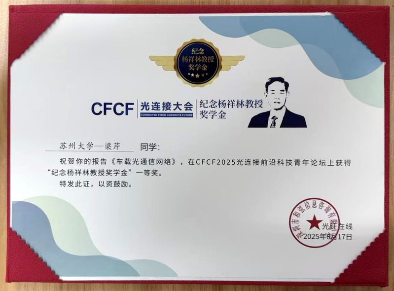 6月16日,第五届光连接大会前沿技术青年论坛在苏州·苏州湾艾美酒店成功举办。本次论坛吸引了国内多所知名高校的老师和同学们的关注和支持,来自苏大、清华、北大、上交、南大、东南、中山等高校的26名青年学子在论坛上进行了口头报告,并争夺“纪念杨祥林教授奖学金”一二三等奖的六个奖项。论坛现场气氛热烈,三场平行学术演讲厅座无虚席。最后,经过来自高校权威学者组成的评委团的严格评审,我院梁芹同学凭借其在论坛上发表的《车载光通信网络》报告荣获该奖项的一等奖。